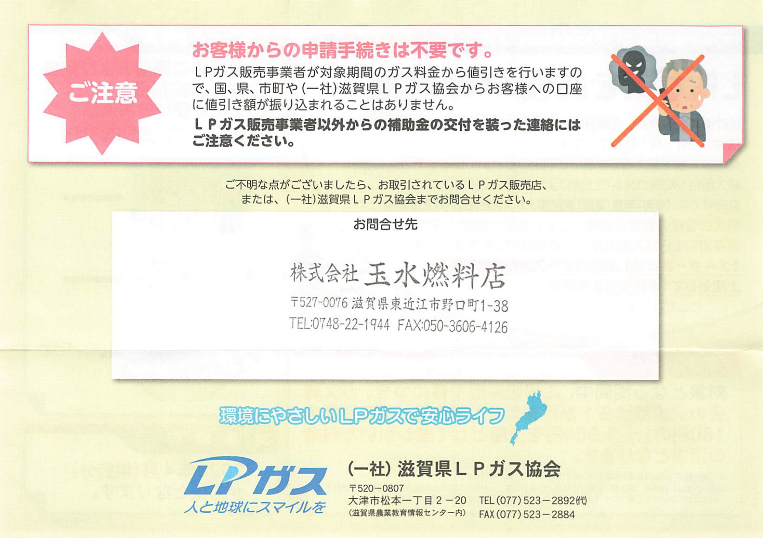 また、滋賀県やLPガス協会からお客様の口座に直接振り込まれることはありません。