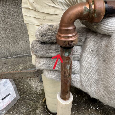 現調の結果、給湯配管(銅管)にピンホール穴が開き(画像矢印部分)、そこから勢いよくお湯が漏れていました。